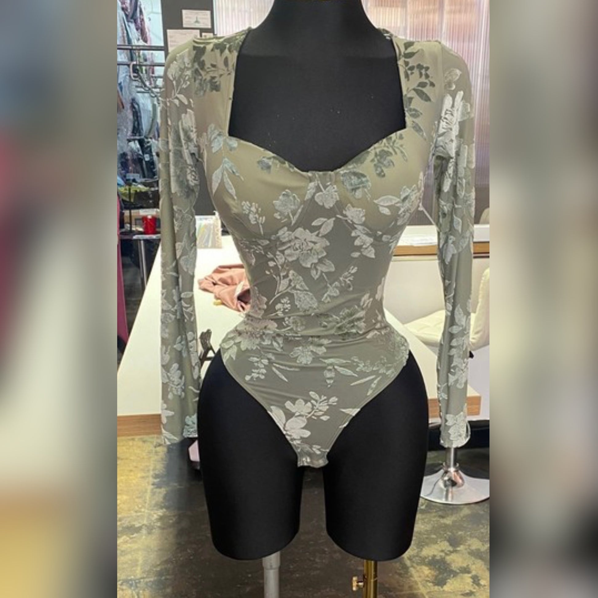 - Mesh long sleeve bodysuit with braw cups and snap thong bottom