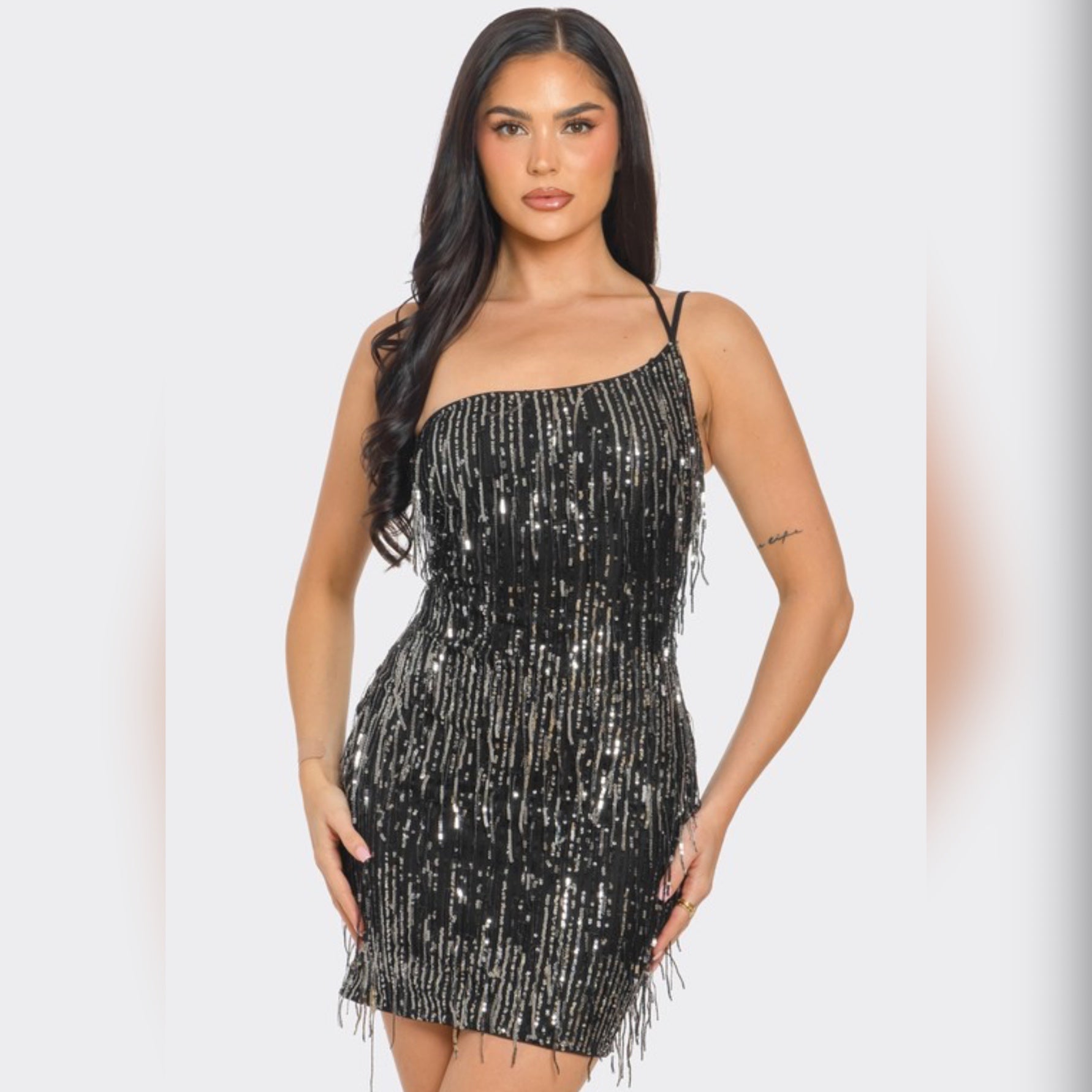 - Off shoulder fringe sequin mini dress